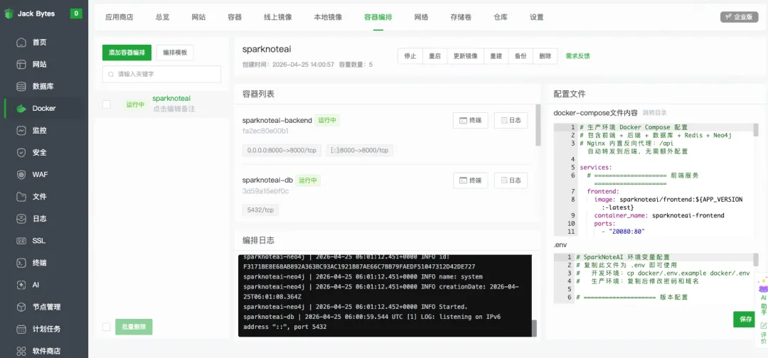 # 生产环境 Docker Compose 配置# 包含前端 + 后端 + 数据库 + Redis + Neo4j# Nginx 内置反向代理:/api 自动转发到后端,无需额外配置services:# ==================== 前端服务 ====================frontend:image:sparknoteai/frontend:${APP_VERSION:-latest}container_name:sparknoteai-frontendports:-"20080:80"depends_on:backend:condition:service_healthynetworks:-sparknoteai-networkrestart:unless-stoppedlabels:-"com.sparknoteai.service=frontend"# ==================== 后端服务 ====================backend:image:sparknoteai/backend:${APP_VERSION:-latest}container_name:sparknoteai-backendports:-"8000:8000"environment:# 注意:不使用 env_file,避免 APP_VERSION 覆盖 Docker 镜像构建时的版本号-DATABASE_URL=postgresql://${POSTGRES_USER:-sparknoteai}:${POSTGRES_PASSWORD}@db:5432/${POSTGRES_DB:-sparknoteai}-REDIS_URL=redis://:${REDIS_PASSWORD}@redis:6379/0-SECRET_KEY=${SECRET_KEY}-ACCESS_TOKEN_EXPIRE_MINUTES=${ACCESS_TOKEN_EXPIRE_MINUTES:-10080}-ENCRYPTION_KEY=${ENCRYPTION_KEY}-COMPATIBLE_CLIENT_VERSIONS=${COMPATIBLE_CLIENT_VERSIONS:-}-ADMIN_USERNAME=${ADMIN_USERNAME:-admin}-ADMIN_PASSWORD=${ADMIN_PASSWORD}-ADMIN_EMAIL=${ADMIN_EMAIL:-admin@example.com}-NEO4J_URI=bolt://neo4j:7687-NEO4J_PASSWORD=${NEO4J_PASSWORD}-DEBUG=falsevolumes:-backend_uploads:/app/data/uploadsdepends_on:db:condition:service_healthyredis:condition:service_healthyneo4j:condition:service_healthynetworks:-sparknoteai-networkrestart:unless-stoppedhealthcheck:test:["CMD","curl","-f","http://localhost:8000/api/health"]interval:30stimeout:10sretries:3start_period:40slabels:-"com.sparknoteai.service=backend"# ==================== PostgreSQL 数据库 ====================db:image:postgres:15-alpinecontainer_name:sparknoteai-dbenv_file:-.envenvironment:POSTGRES_DB:${POSTGRES_DB:-sparknoteai}POSTGRES_USER:${POSTGRES_USER:-sparknoteai}POSTGRES_PASSWORD:${POSTGRES_PASSWORD}volumes:-postgres_data:/var/lib/postgresql/data-./postgres/init.sql:/docker-entrypoint-initdb.d/init.sql:ronetworks:-sparknoteai-networkrestart:unless-stoppedhealthcheck:test:["CMD-SHELL","pg_isready -U sparknoteai -d sparknoteai"]interval:10stimeout:5sretries:5labels:-"com.sparknoteai.service=database"# ==================== Redis 缓存 ====================redis:image:redis:7-alpinecontainer_name:sparknoteai-redisenv_file:-.envcommand:redis-server--appendonlyyes--requirepass${REDIS_PASSWORD}expose:-"6379"volumes:-redis_data:/datanetworks:-sparknoteai-networkrestart:unless-stoppedhealthcheck:test:["CMD","redis-cli","--pass","${REDIS_PASSWORD}","ping"]interval:10stimeout:5sretries:5labels:-"com.sparknoteai.service=redis"# ==================== Neo4j 知识图谱 ====================neo4j:image:neo4j:5-communitycontainer_name:sparknoteai-neo4jenvironment:-NEO4J_AUTH=neo4j/${NEO4J_PASSWORD}-NEO4J_PLUGINS=["apoc"]-NEO4J_dbms_security_procedures_unrestricted=apoc.*expose:-"7474"-"7687"volumes:-neo4j_data:/datanetworks:-sparknoteai-networkrestart:unless-stoppedhealthcheck:test:["CMD","wget","--no-verbose","--tries=1","--spider","http://localhost:7474/"]interval:15stimeout:10sretries:5labels:-"com.sparknoteai.service=neo4j"# ==================== 数据卷 ====================volumes:# 后端backend_uploads:# 数据库postgres_data:redis_data:neo4j_data:# ==================== 网络 ====================networks:sparknoteai-network:driver:bridge