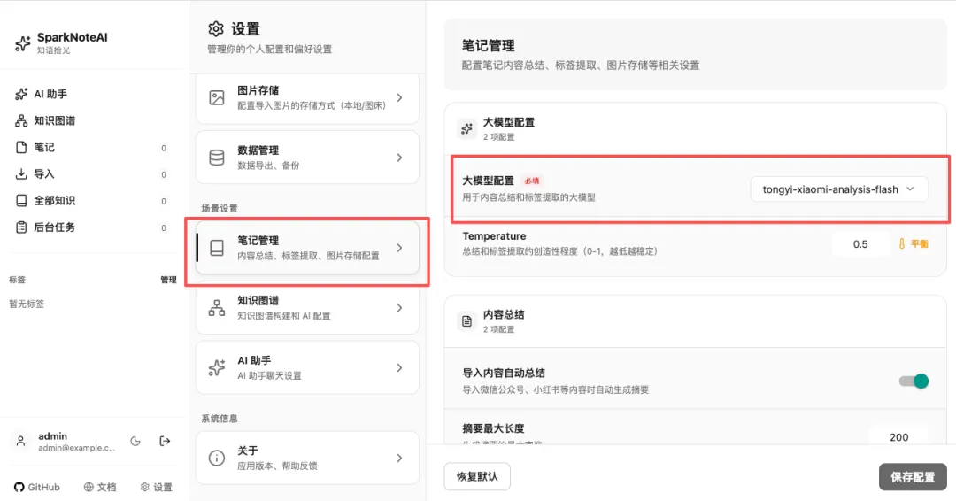 然后在场景配置中,分别在「笔记管理」、「知识图谱」、「AI 助手」中选择刚才添加的大模型: