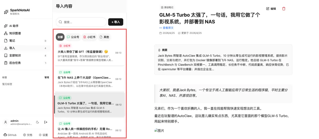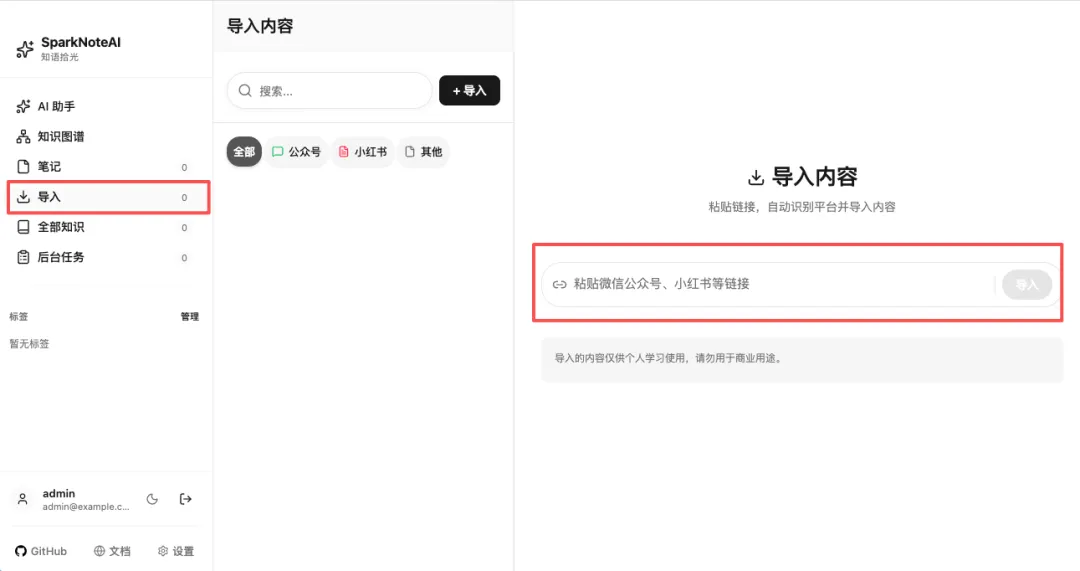 碎片化内容采集: 支持微信公众号、小红书多平台导入,后台任务队列异步处理 -