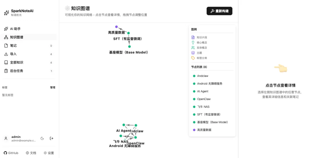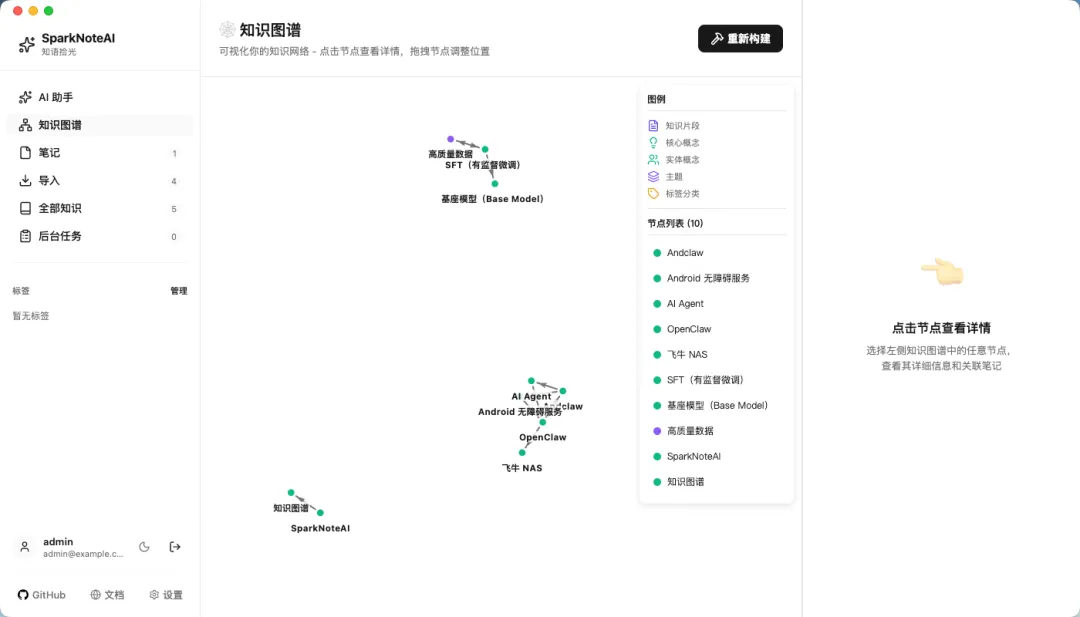 SparkNoteAI 是一个现代化的知识整理与管理系统,融合了大模型智能总结、知识图谱可视化和多平台内容采集能力。帮助你从碎片化信息中构建结构化知识体系。