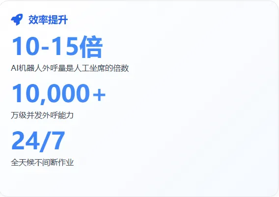 人工外呼受限于工作时间、生理疲劳,一天最多拨打几百通电话,还容易出现拨号错误、沟通疏漏;而AI机器人外呼完全打破时间限制,7×24小时不间断拨号,一天可完成数千通甚至上万通外呼,效率是人工的5-10倍。