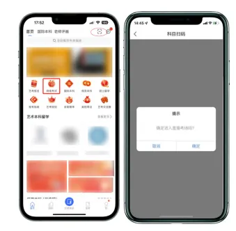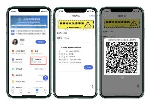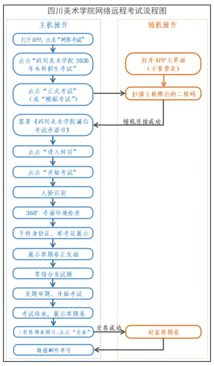 主机在考前登录“艺术升”APP在首页或报考页选择“网络考试”,进入“四川美术学院2026年本科招生”,点击“正式考试”按键,弹出二维码。此时需要用辅机打开“艺术升”APP(注意:辅机只打开“艺术升”主页,不要登录“艺术升”),在辅机“艺术升”首页左上角打开扫描工具“[-]”,辅机扫描主机上弹出的二维码,辅机扫码成功后进入考试状态。