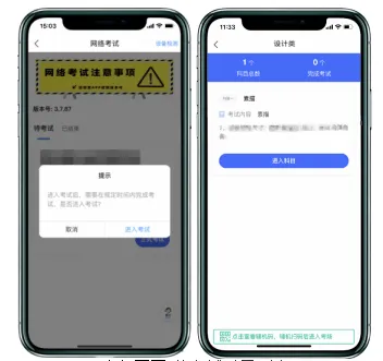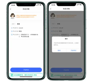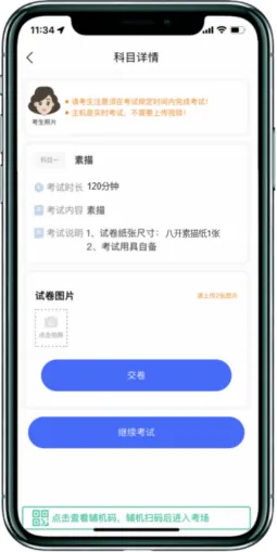 在进入正式考试前请仔细阅读“提示”信息,继续选择“开始考试”。如辅机网络异常中断,可点击主机本页的绿色区域,辅机扫码连接。