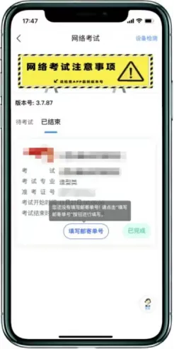 封装好的答题卷须于考试结束当天通过中国邮政EMS邮寄,有特殊情况的考生最迟不晚于第二天中午12点前寄出。未按规定时间寄出答题卷的考生视为放弃考试。考生寄出答题卷后,考生在主机“网络考试”页面点击“已结束”,在对应考试内“填写邮寄单号”。至此,本场考试全部操作步骤完成!