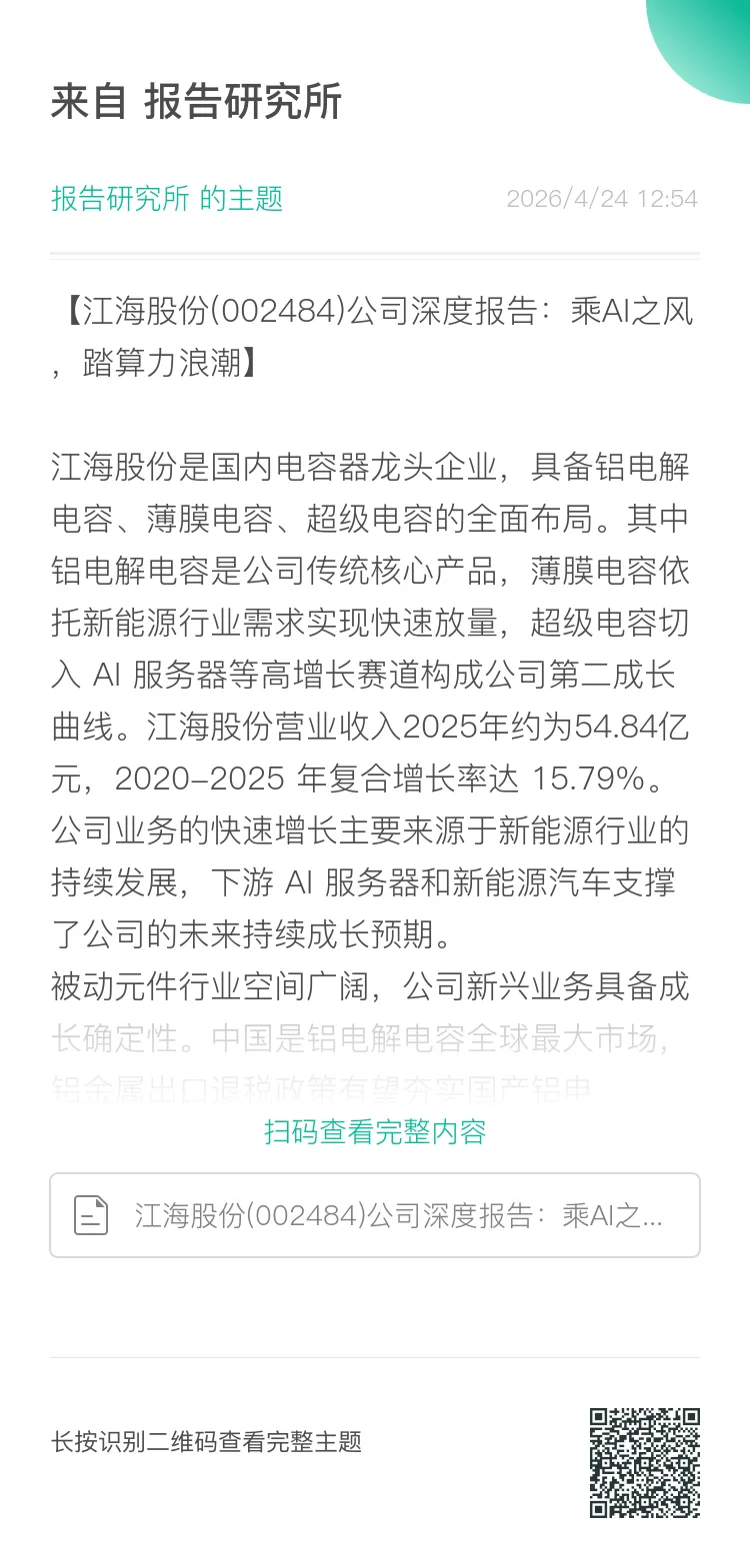 南通江海电容器股份有限公司(简称“江海股份”)是国内电容器行业龙头,也是全球少数实现铝电解电容、薄膜电容、超级电容三大品类全产业链布局的标杆厂商。公司前身为 1958 年成立的“平潮镇福利社”,历经 68 年产业深耕,核心产品线从单一铝电解电容出发,完成了多品类、全产业链的持续拓展。2010 年于深交所挂牌上市,总部位于江苏南通,目前已成长为国内被动元件领域兼具全产业链壁垒、高端技术实力与全球化客户布局的核心领军企业。