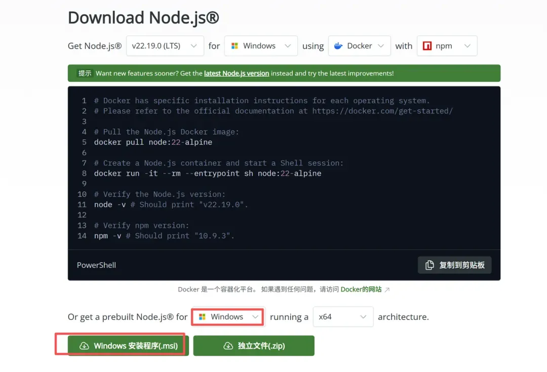 在Node.js官网下载对应的安装包,如下网址: https://nodejs.org/zh-cn/download 下载完成, 直接安装,在电脑终端。