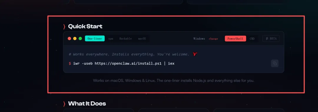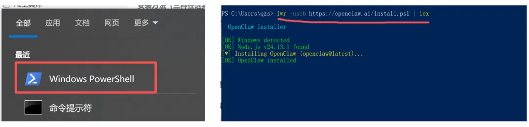 # 1. 以管理员身份打开PowerShell# 2. 执行安装命令iwr -useb https://openclaw.ai/install.ps1 | iex# 或使用备用地址iwr -useb https://clawd.bot/install.ps1 | iex