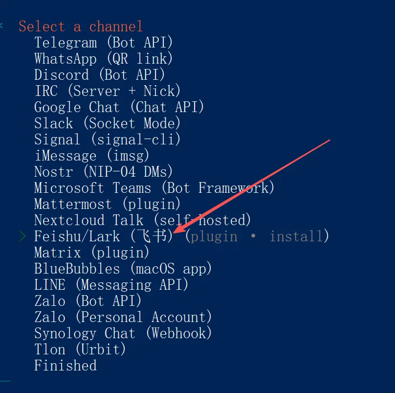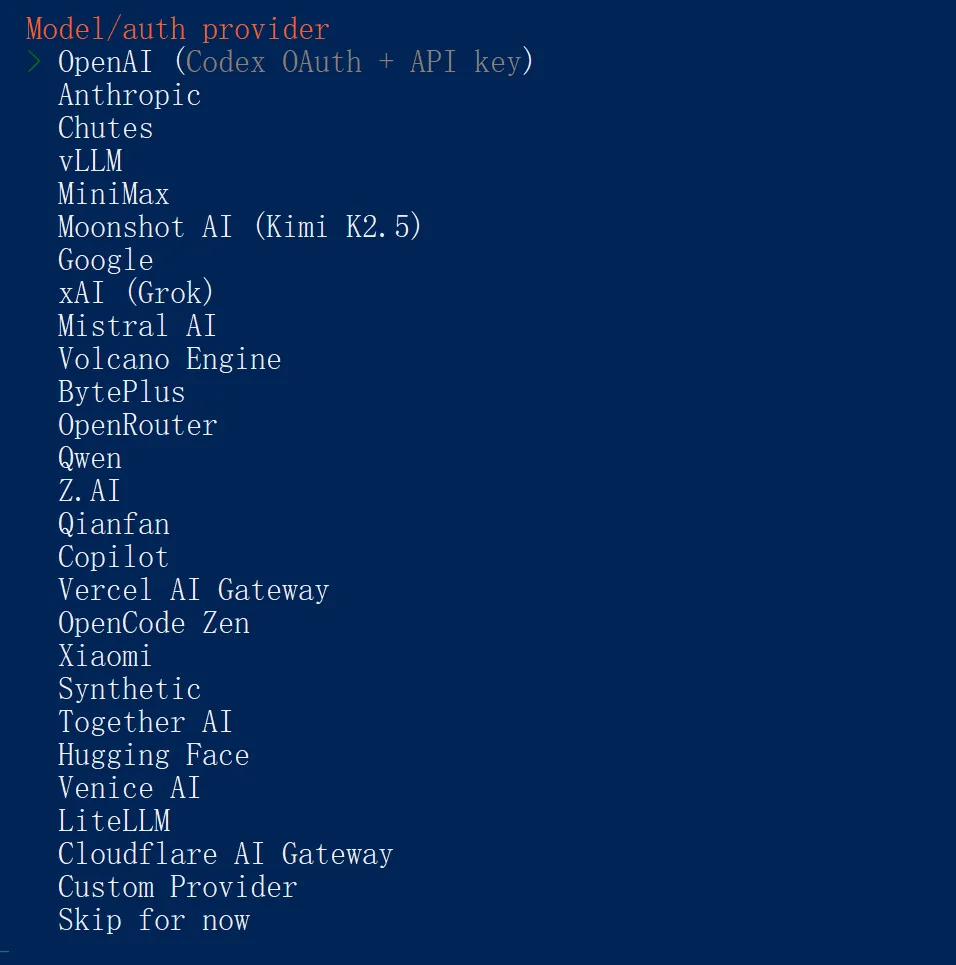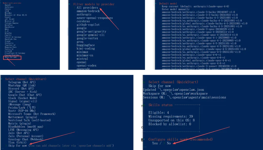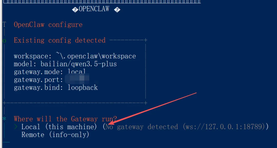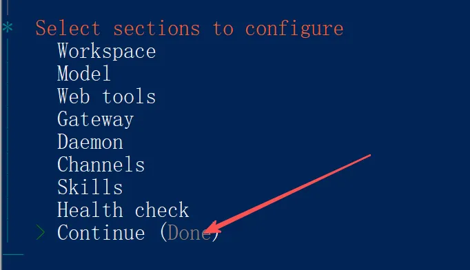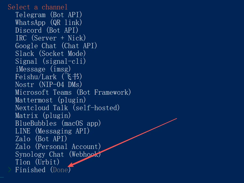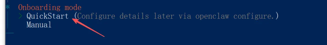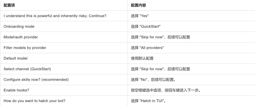 安装结束后会自动出现提示信息,请根据提示信息完成 OpenClaw 配置,参考配置如下:
