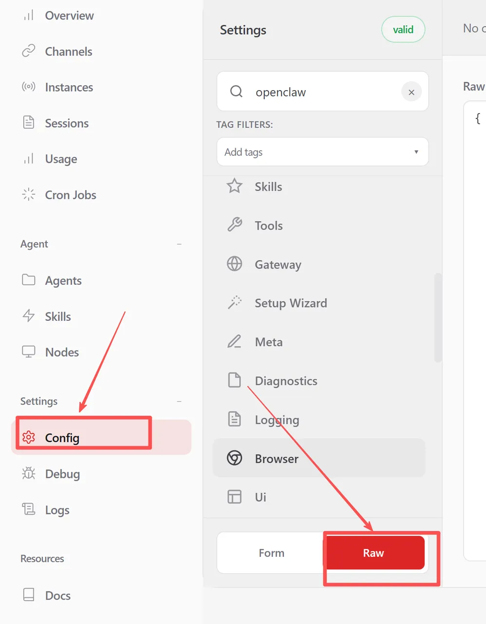 然后在Web UI的左侧菜单栏中选择Config > Raw。