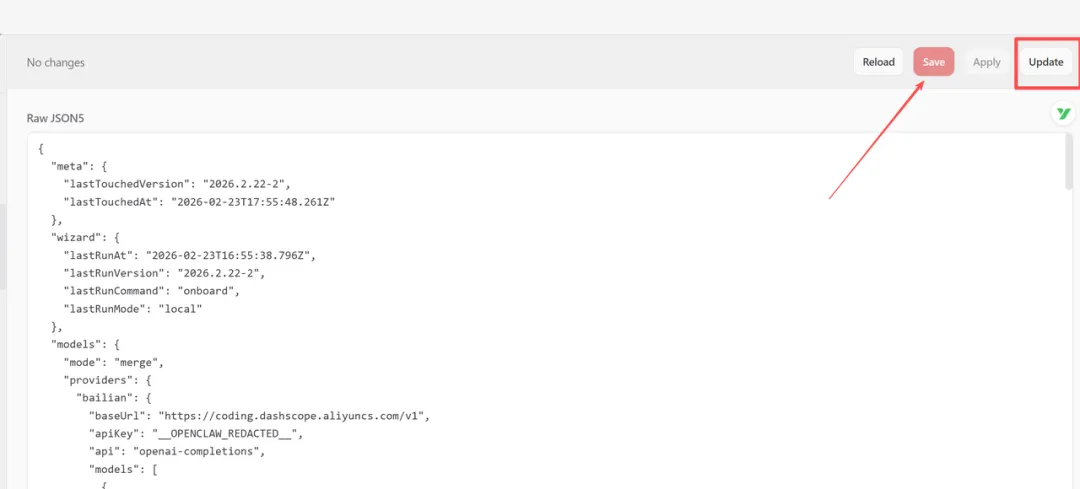 如果在Web UI中修改,先单击右上角 Save 保存,然后单击 Update来使配置生效。