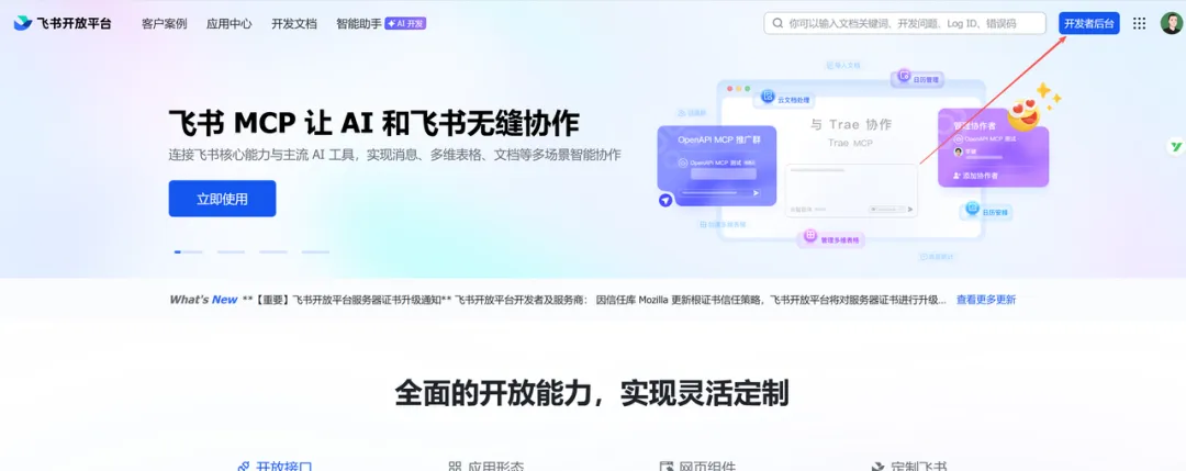 访问飞书开放平台:在浏览器中打开 open.feishu.cn ,登录后,选择【开发者后台】