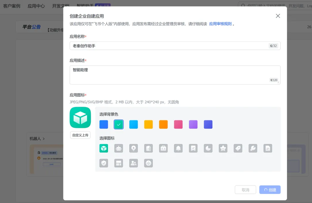 给你的应用起个名字(比如“我的AI助手”),上传个图标,然后点击创建 。