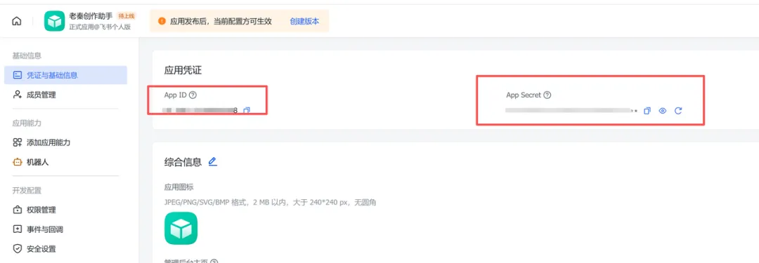 创建成功后,进入应用详情页,点击左侧菜单的 “凭证与基础信息” 。