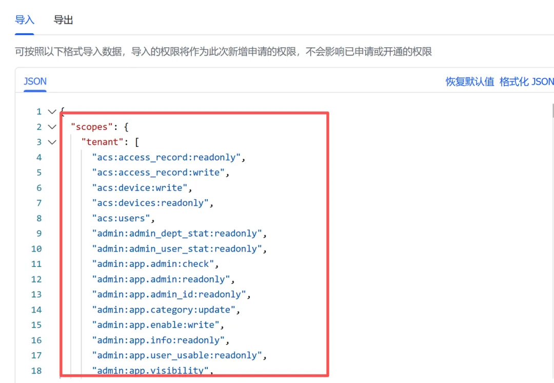 {"scopes": {"tenant": ["acs:access_record:readonly","acs:access_record:write","acs:device:write","acs:devices:readonly","acs:users","admin:admin_dept_stat:readonly","admin:admin_user_stat:readonly","admin:app.admin:check","admin:app.admin:readonly","admin:app.admin_id:readonly","admin:app.category:update","admin:app.enable:write","admin:app.info:readonly","admin:app.user_usable:readonly","admin:app.visibility","admin:badge","admin:badge.grant","admin:ent_email_password","aily:data_asset:read","aily:data_asset:upload_file","aily:data_asset:write","aily:file:read","aily:file:write","aily:knowledge:ask","aily:knowledge:read","aily:knowledge:write","aily:message:read","aily:message:write","aily:run:read","aily:run:write","aily:session:read","aily:session:write","aily:skill:read","aily:skill:write","app_engine:application.environment_variable:read","app_engine:application.event:read","app_engine:application.function:write","app_engine:application.log:read","app_engine:application.metric:read","app_engine:approval:read","app_engine:approval:write","app_engine:attachment:read","app_engine:attachment:write","app_engine:data.record.change:read","app_engine:dataset.meta:read","app_engine:dataset.record:read","app_engine:flow:write","app_engine:global_option:read","app_engine:object.meta:read","app_engine:object.record:read","app_engine:object.record:write","app_engine:record_permission.member:write","app_engine:role.member:write","app_engine:role:read","application:application","application:application.app_message_stats.overview:readonly","application:application.app_package","application:application.app_usage_stats.overview:readonly","application:application.app_version","application:application.app_version:readonly","application:application.bot.operator_name:readonly","application:application.collaborators:write","application:application.contacts_range:write","application:application.feedback.feedback_info","application:application:self_manage","application:bot.menu:readonly","application:bot.menu:write","approval:approval","approval:approval.list:readonly","approval:approval:readonly","approval:definition","approval:external_approval","approval:external_instance","approval:instance","approval:instance.comment","approval:task","attendance:overtime_approval:write","attendance:rule","attendance:rule:readonly","attendance:task","attendance:task:readonly","attendance_machine:check_in_record:write","attendance_machine:device:write","attendance_machine:users","baike:entity","baike:entity:exempt_delete","baike:entity:exempt_review","baike:entity:readonly","base:app:copy","base:app:create","base:app:read","base:app:update","base:collaborator:create","base:collaborator:delete","base:collaborator:read","base:dashboard:copy","base:dashboard:read","base:field:create","base:field:delete","base:field:read","base:field:update","base:form:read","base:form:update","base:record:create","base:record:delete","base:record:read","base:record:retrieve","base:record:update","base:role:create","base:role:delete","base:role:read","base:role:update","base:table:create","base:table:delete","base:table:read","base:table:update","base:view:read","base:view:write_only","bitable:app","bitable:app:readonly","block:entity","block:message","board:whiteboard:node:create","board:whiteboard:node:delete","board:whiteboard:node:read","board:whiteboard:node:update","calendar:calendar","calendar:calendar.acl:create","calendar:calendar.acl:delete","calendar:calendar.acl:read","calendar:calendar.event:create","calendar:calendar.event:delete","calendar:calendar.event:read","calendar:calendar.event:reply","calendar:calendar.event:update","calendar:calendar.free_busy:read","calendar:calendar:create","calendar:calendar:delete","calendar:calendar:read","calendar:calendar:readonly","calendar:calendar:subscribe","calendar:calendar:update","calendar:exchange.bindings:create","calendar:exchange.bindings:delete","calendar:exchange.bindings:read","calendar:room","calendar:room:readonly","calendar:settings.caldav:create","calendar:settings.workhour:read","calendar:time_off:create","calendar:time_off:delete","calendar:timeoff","cardkit:card:read","cardkit:card:write","cardkit:template:read","collab_plugins:collab_plugins","collab_plugins:collab_plugins.relation.change:read","contact:contact","contact:contact.base:readonly","contact:contact:update_department_id","contact:contact:update_user_id","contact:department.base:readonly","contact:department.hrbp:readonly","contact:department.organize:readonly","contact:functional_role","contact:functional_role:readonly","contact:group","contact:group:readonly","contact:job_family","contact:job_family:readonly","contact:job_level","contact:job_level:readonly","contact:job_title:readonly","contact:role:readonly","contact:unit","contact:unit:readonly","contact:user.assign_info:read","contact:user.base:readonly","contact:user.department:readonly","contact:user.dotted_line_leader_info.read","contact:user.email:readonly","contact:user.employee:readonly","contact:user.employee_id:readonly","contact:user.employee_number:read","contact:user.gender:readonly","contact:user.id:readonly","contact:user.job_family:readonly","contact:user.job_level:readonly","contact:user.phone:readonly","contact:user.subscription_ids:write","contact:user.user_geo","contact:work_city:readonly","corehr:additional_job.compensation_type:read","corehr:additional_job.compensation_type:write","corehr:additional_job.job:read","corehr:additional_job.job:write","corehr:additional_job.job_level:read","corehr:additional_job.job_level:write","corehr:additional_job.position:read","corehr:additional_job.position:write","corehr:additional_job.service_company:read","corehr:additional_job.service_company:write","corehr:additional_job.work_shift:read","corehr:additional_job.work_shift:write","corehr:additional_job:read","corehr:additional_job:write","corehr:approval_groups.orgdraft_department_change:read","corehr:approval_groups.orgdraft_job_change:read","coreh