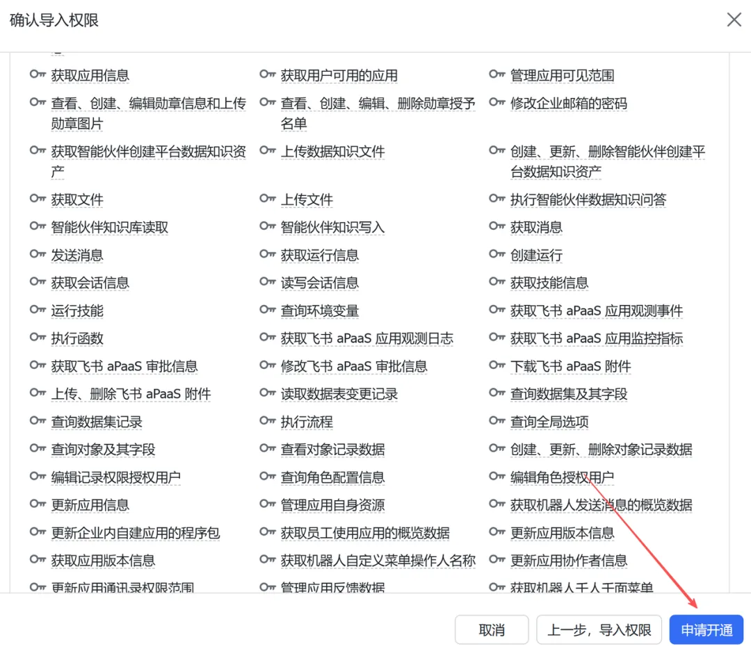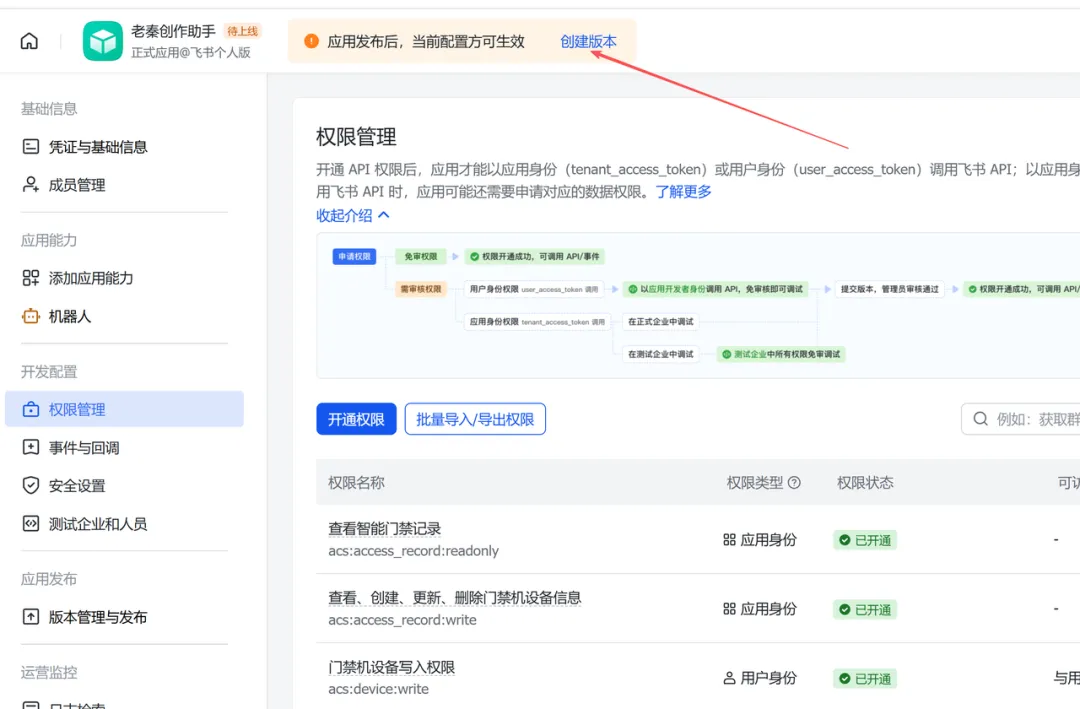 开通权限后,点击上方的创建版本, 默认选项, 版本我输入的是1.0.0,随便填写, 点击确认发布。