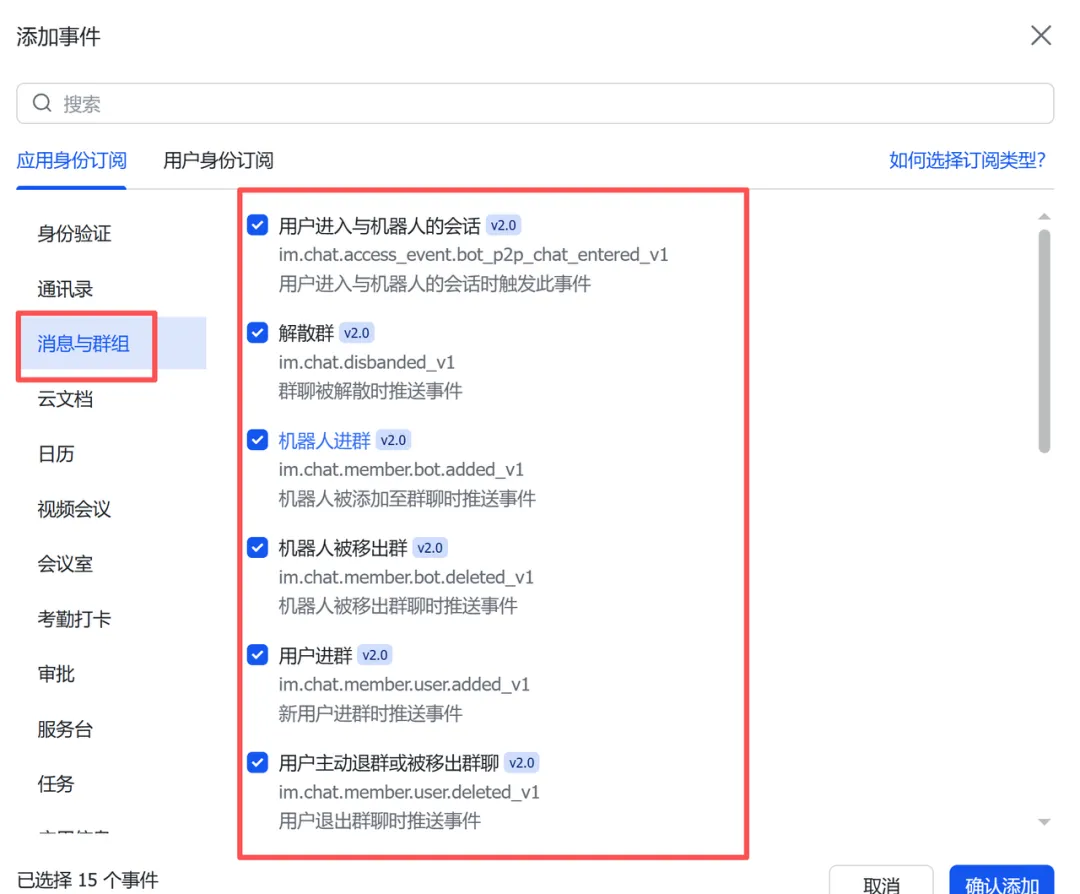 选择【消息与群组】,把所有事件全部选中,点击【确认添加】