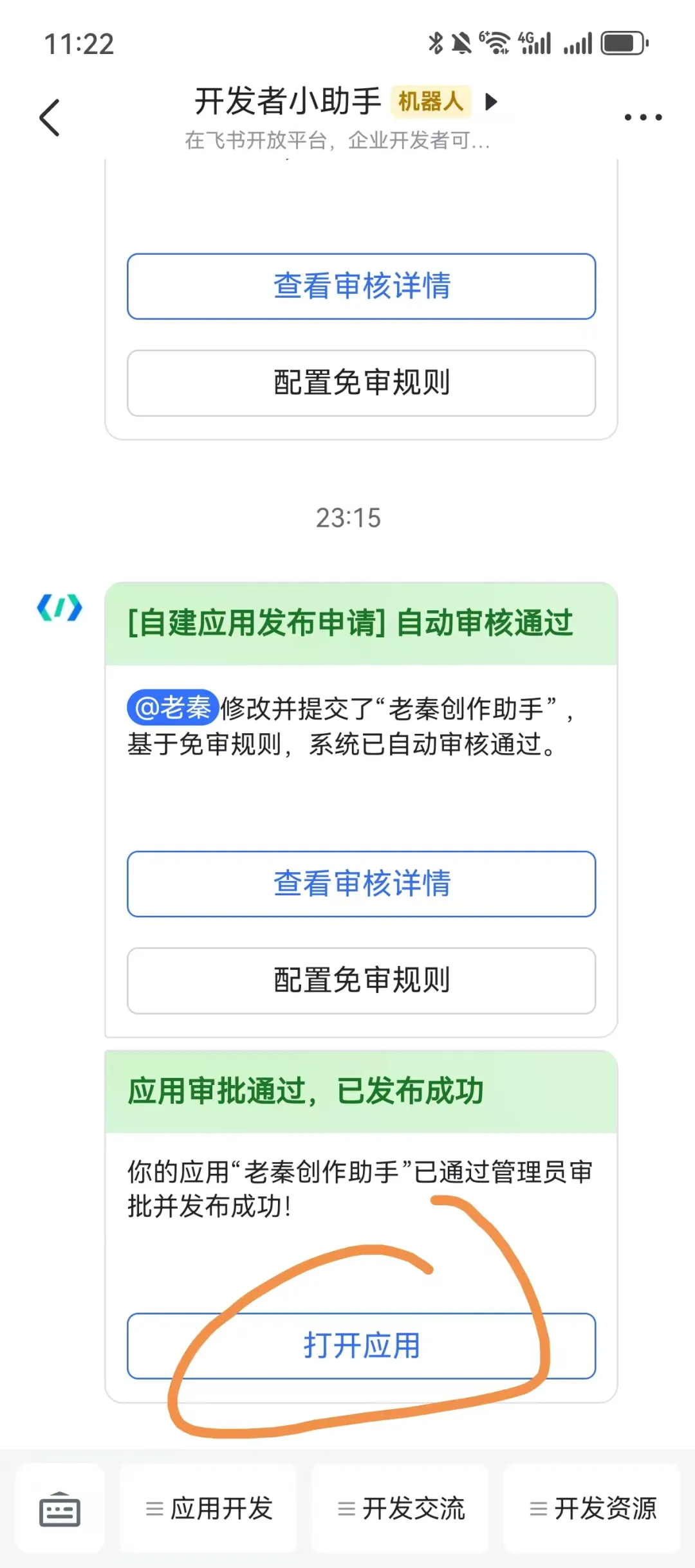 打开飞书APP,会有消息提示,如下,点击【打开应用】