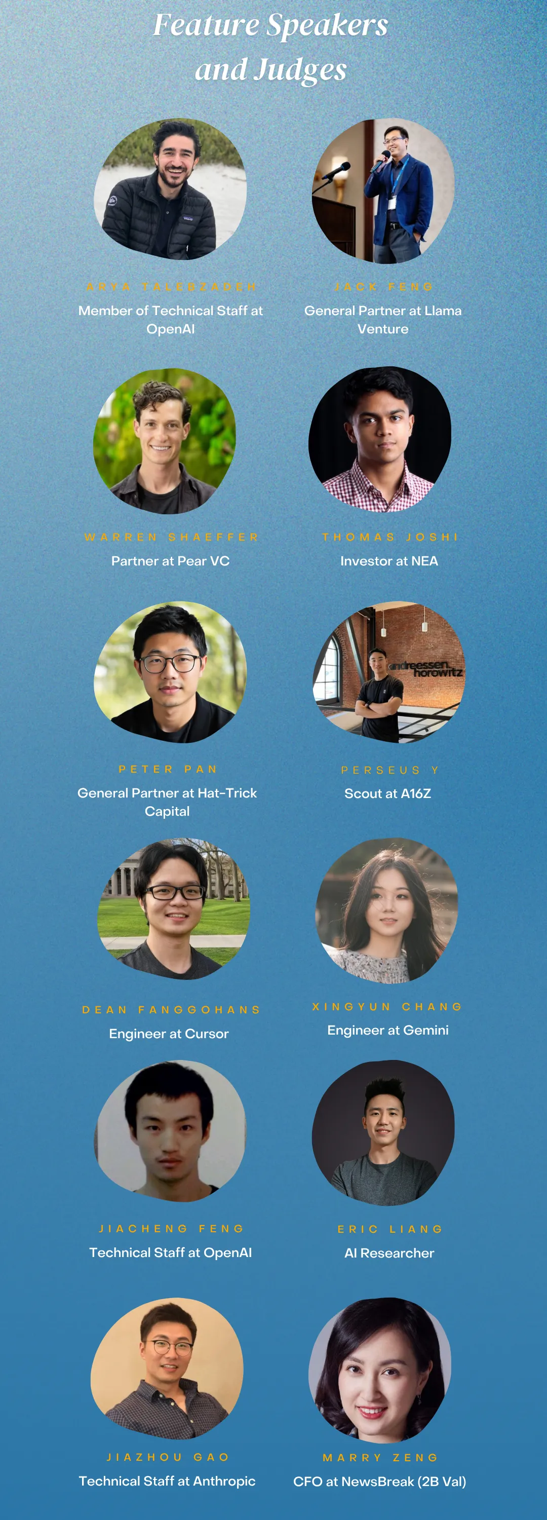 它不是面向海外游客包装出来的硅谷参访,而是真正发生在硅谷创业社区里的本地活动。现场参与者以硅谷本地 AI builders、创业者、投资人和技术从业者为主,很多嘉宾和评委都来自硅谷一线创业和投资生态,包括 OpenAI、Anthropic、Gemini、NEA、A16Z、Pear VC、Llama Ventures等机构或公司背景。活动页面显示,目前已有 800人报名参与,并采取审核制报名。