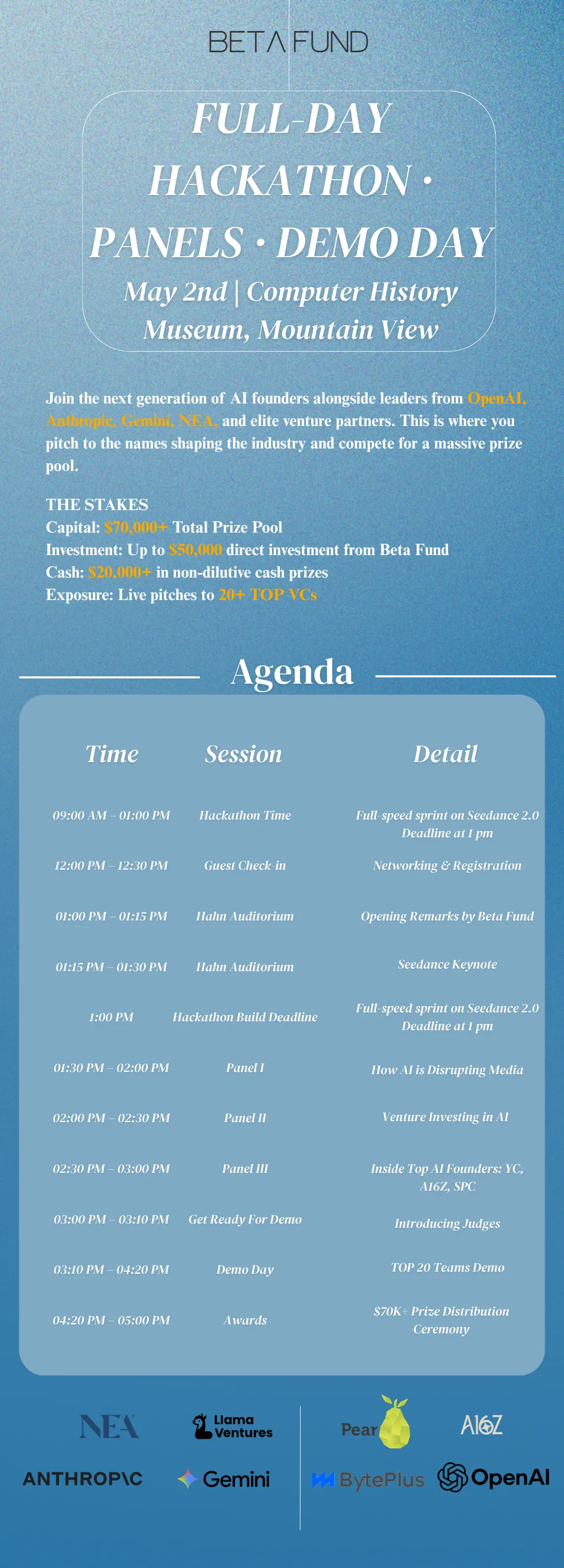 本次大会采用“双会场”设计。一个会场是 Hackathon Build Track,AI 创业团队将在现场进行高强度产品搭建,从想法出发,在数小时内完成产品雏形和提交;另一个会场则是 Panels + Demo Day,围绕 AI 对媒体、投资和前沿技术的影响展开讨论,并在下午进行 20 支精选团队的现场 Demo 路演。大会设置了 $50,000 Beta Fund 投资机会、$20,000+ 现金奖励,同时让参赛团队有机会直接面对 20+ 活跃 VC。