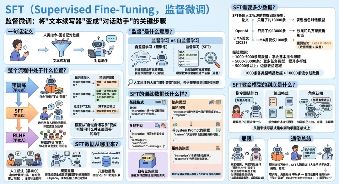 SFT是用人工标注的”指令-回答”配对数据来训练模型,教会它理解人类指令并给出合适的回答,是把一个”文本续写器”变成”对话助手”的关键步骤。