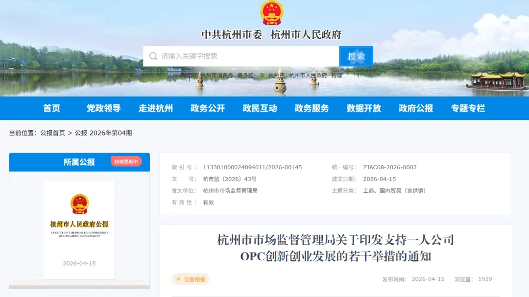 近日,浙江省杭州市发布《支持一人公司OPC创新创业发展的若干举措》,《若干举措》在以专章形式明确优化信用赋能,助力OPC成长。