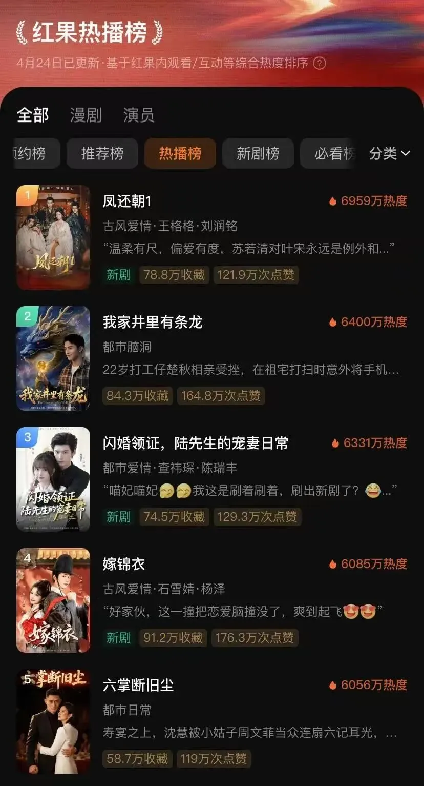 花树的话: 从业者在分析爆款时,不要只盯着热度值——收藏量和点赞量是更能反映内容质量的指标。一部”高热度低收藏”的剧,可能靠的是投流或话题炒作;而一部”收藏量碾压热度排名”的剧,说明内容本身让用户觉得”值得反复看”。