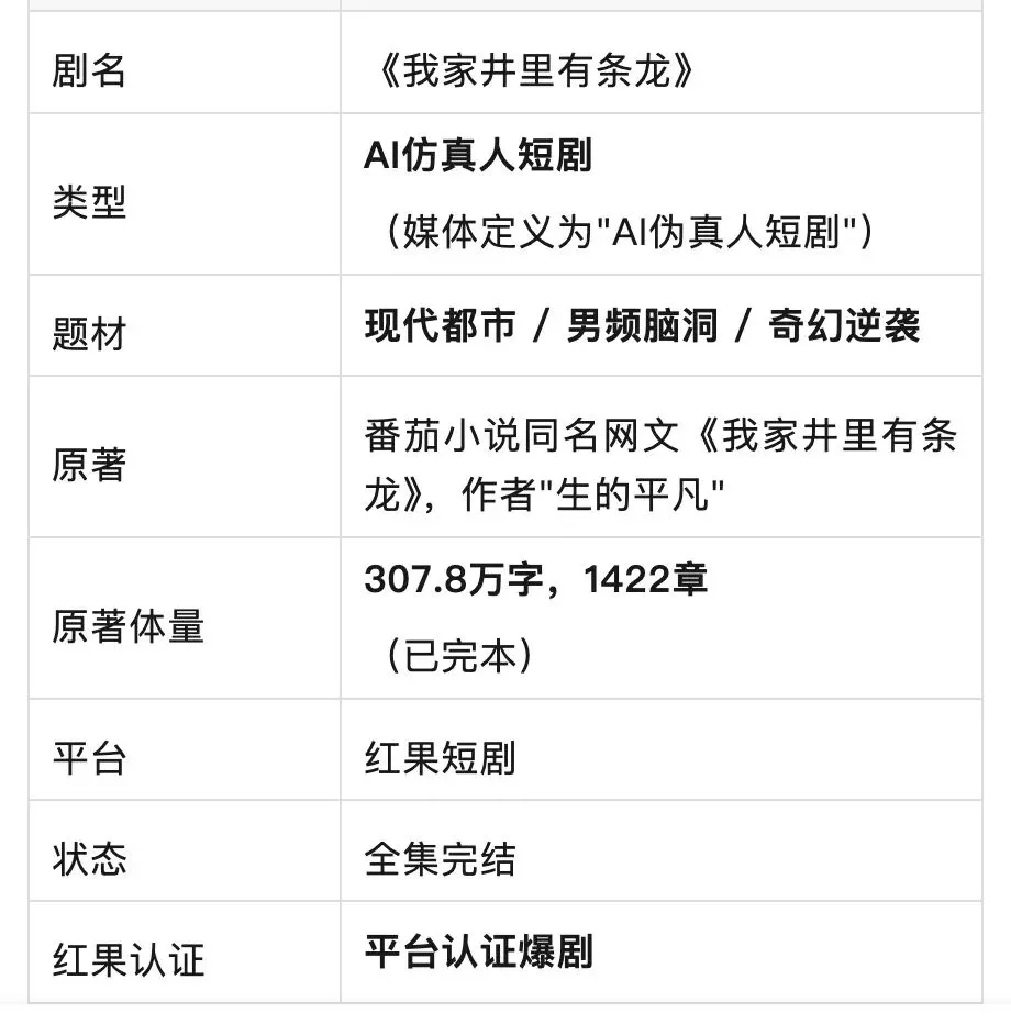 《我家井里有条龙》的成功路径:番茄小说验证IP → AI技术降本制作 → 红果短剧分发变现。