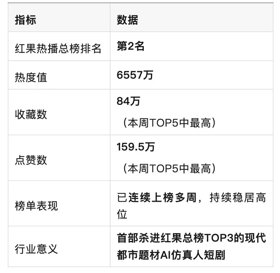 要知道,此前所有杀进红果总榜前列的AI短剧——《菩提临世》《斩仙台》《风水天师》《万兽独尊》——清一色都是古装/玄幻/神话题材。行业有一个几乎公认的判断:AI仿真人剧目前只能在”重视觉、弱表演”的玄幻类题材上打赢真人剧,而现代都市题材是真人短剧的最后堡垒。