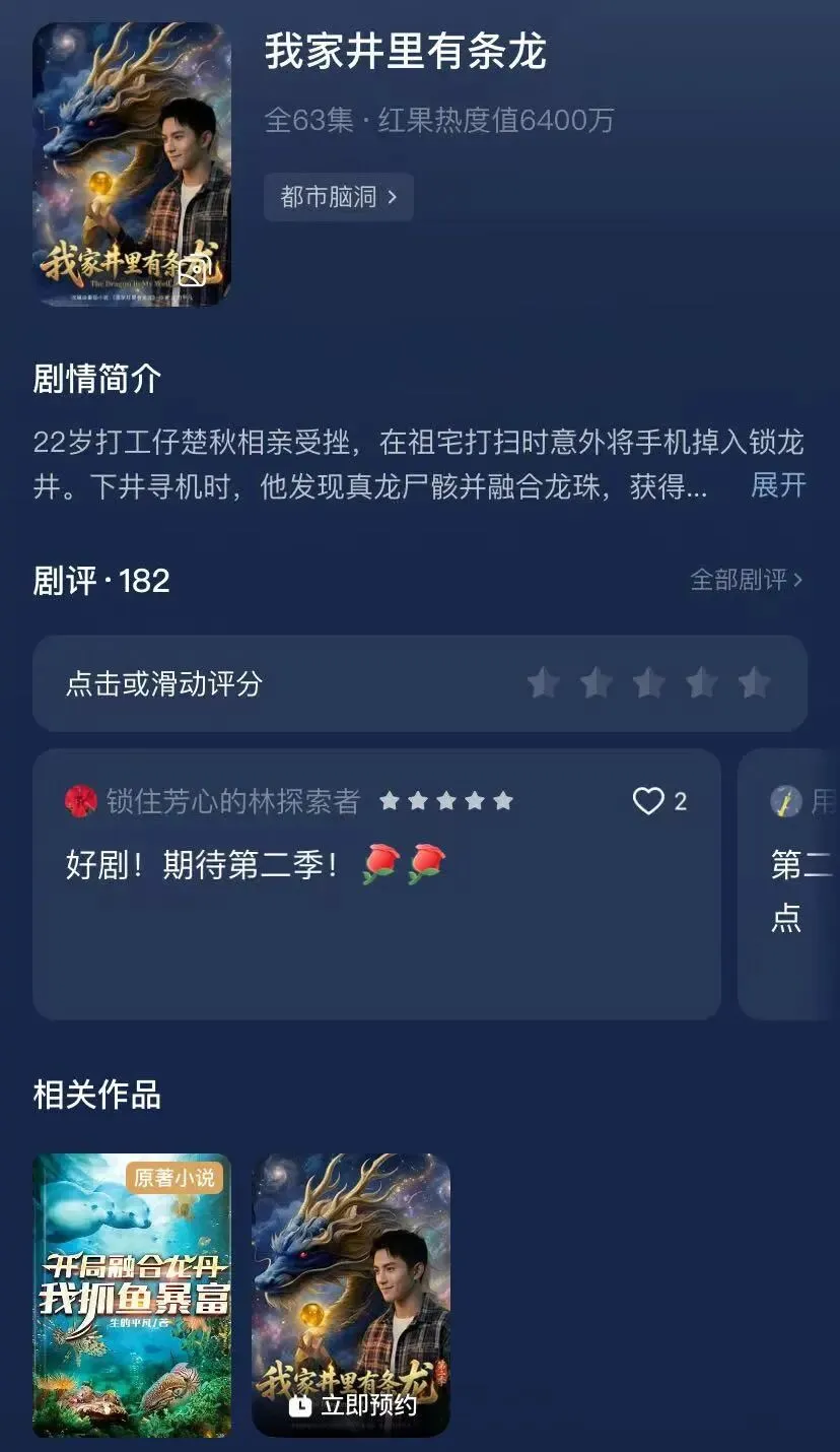 《我家井里有条龙》的收藏量是同期TOP1真人剧的1.8倍。在红果的分账体系中,高收藏=高复看率=更长的分账尾巴。