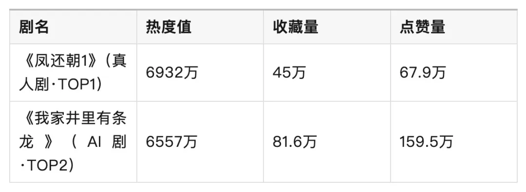 也就是说:《我家井里有条龙》的收藏量是TOP1真人剧的1.8倍,点赞量是2.3倍。 热度值虽然略低(6557万 vs 6932万),但在用户深度互动指标上,这部AI剧完胜。