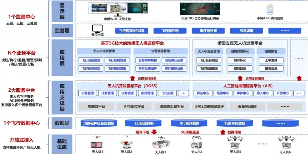 融合低空传输、无人机飞控平台等,为地铁保护工作提供了全方位、高效且可靠的技术支撑,巡查过程中能够快速、稳定传输高清图像、视频和识别结果,实时反馈现场巡查数据,使得监管人员能够及时接收预警、精确判断并迅速采取处置措施,贯穿了“规划、执行、监管、预警、预判、确认、处置、分析”8大业务执行关键环节,推动地铁安全管理向更加智能化、自动化的方向发展。实现多线路无人机同时巡检。