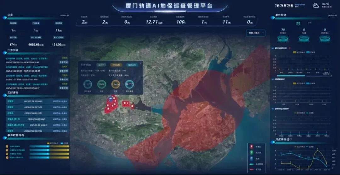 本项目已在厦门地铁东孚车辆段完成部署,以东孚为中心,分别辐射林埭西、天竺山、集美岛、马銮中心四条巡查线路,单架飞行器日均巡飞里程可达25-30公里,人工巡查1小时的工作量,利用无人机巡查可在13分钟完成。单次巡查效率较人工提升78%,日均覆盖30公里,累计识别违规施工200余次,违规施工事件发现率提高30%以上,实现轨道交通精准精细治理。