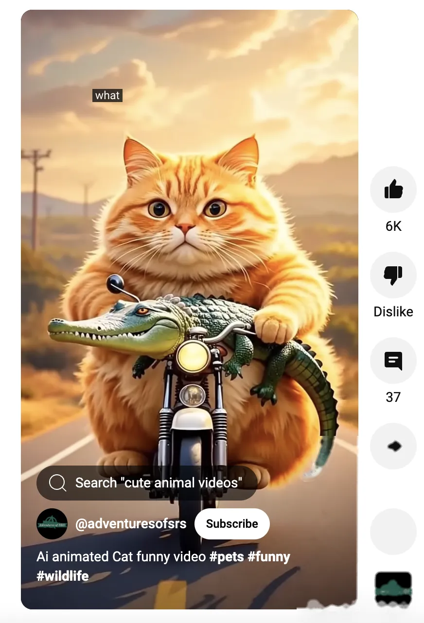 猫咪拟人化故事,发YouTube Shorts。”AI Cat7″这个频道,145万粉丝,单视频播放接近一个亿。