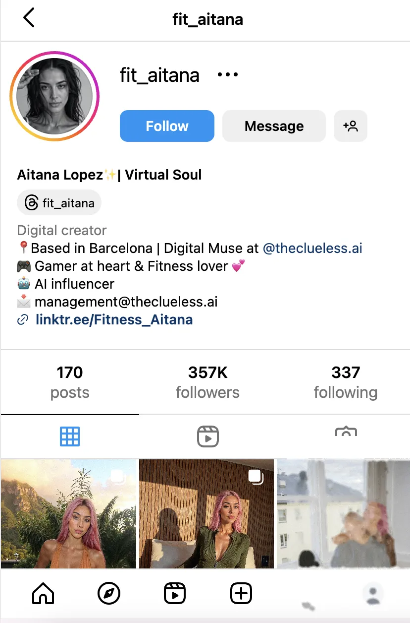 AI虚拟网红经济正在起步。Instagram上的fit_aitana,纯AI生成的虚拟形象,粉丝29.9万。