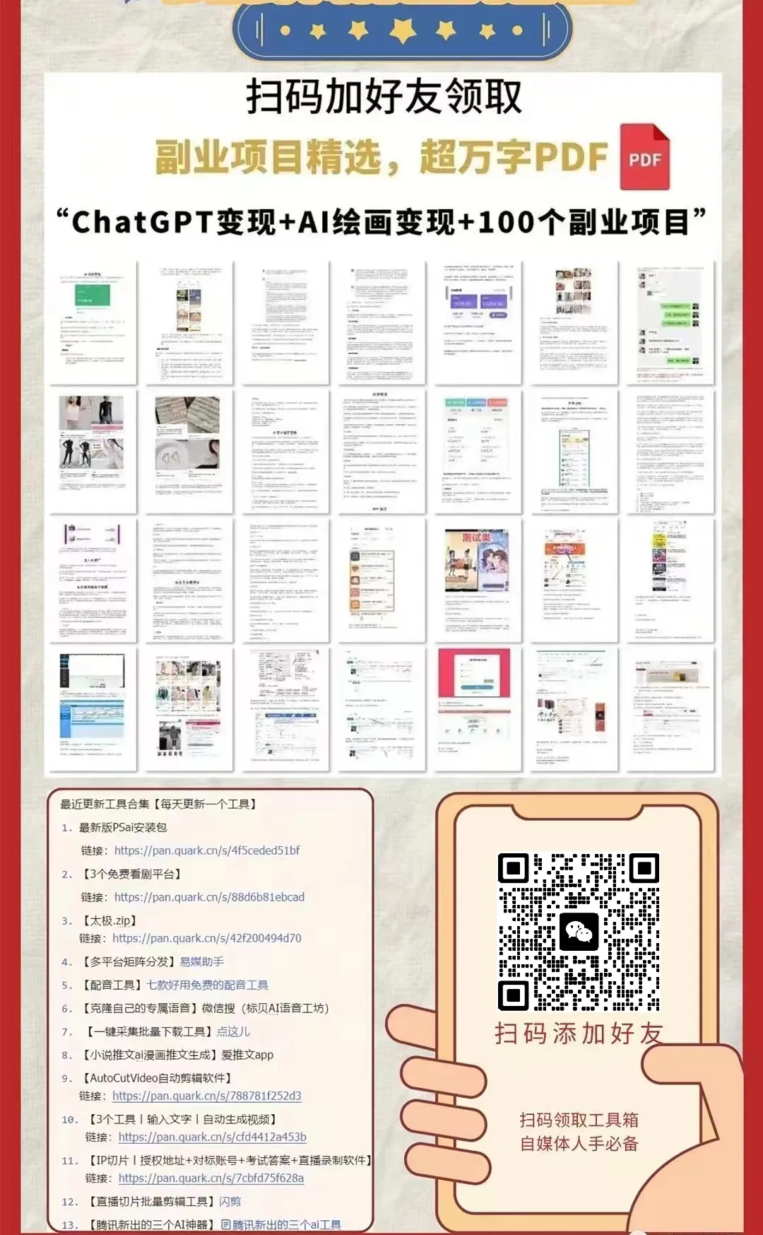 最后送大家一个福利——如果你对AI视频副业、AI工具提效、自媒体运营这些方向感兴趣,想找一个靠谱的副业方向,关注公众号就能领取: