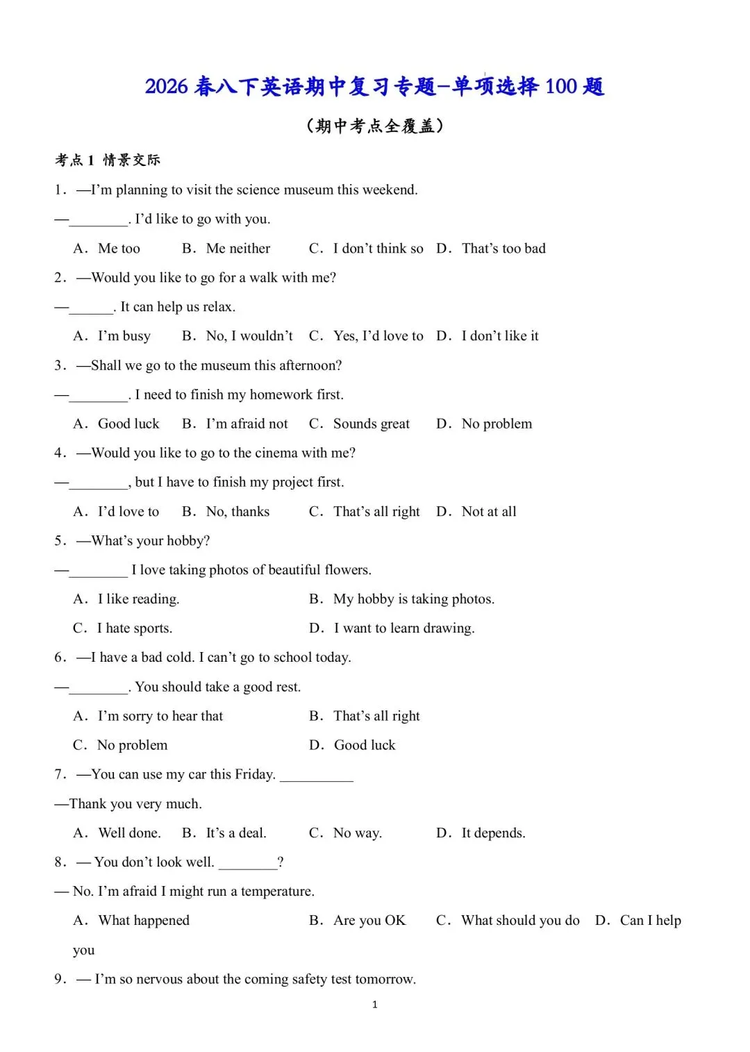 新八下期中复习单选 100(文末下载)