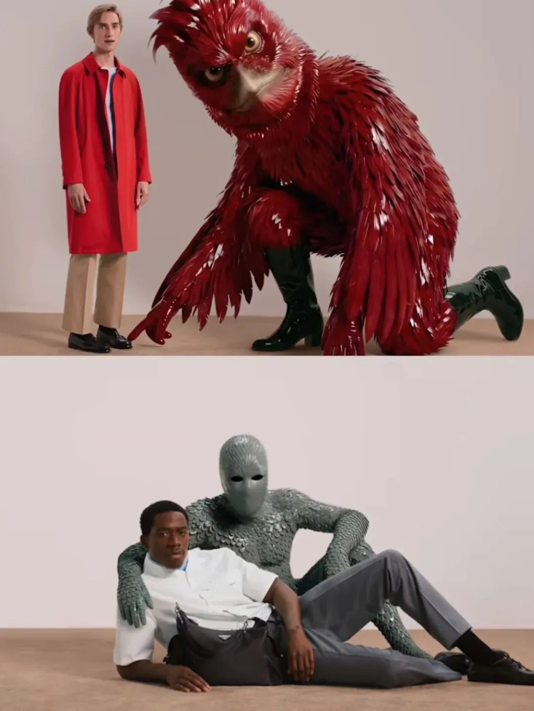 此次的核心创作艺术家是Jordan Wolfson,全程主导视觉与叙事。广告中使用了超现实的“AI感生物”:巨型、有羽毛和鳞片的大鸟与怪兽,色彩丰富,粉、红、黑、棕、绿皆有。