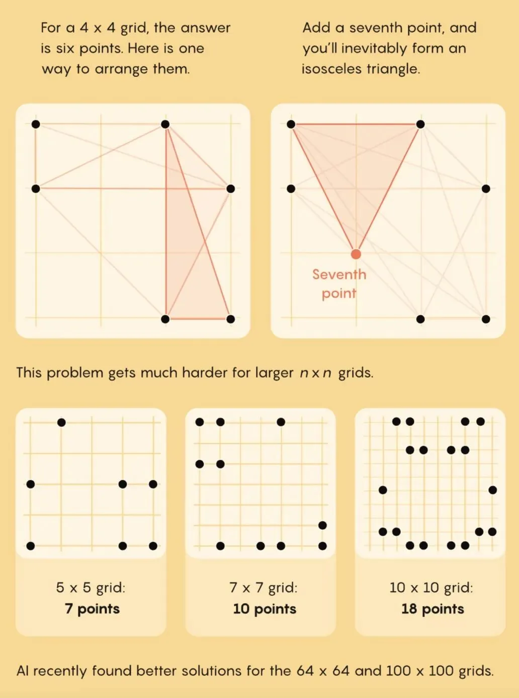 但在最初几年,这只是一个冷门领域。起初,Charton 和其他少数人使用 AI 解决已知答案的问题,只是为了看看新技术能否奏效。到 2024 年,他们开始取得进展。他们寻找有丰富数据可供分析的问题,然后用 AI 构建具有可量化属性的数学对象 —— 例如在网格上放置点以避免形成等腰三角形的最佳排列方式。