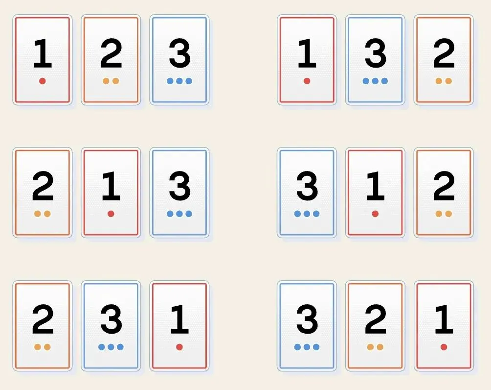 如果你只有一张牌,你无法洗牌。所以置换群 S₁只有一个元素。S₂有两个元素:如果你有两张牌,它们可以有两种排列顺序。S₃变得稍微复杂一些:三张牌有六种不同的排列方式。