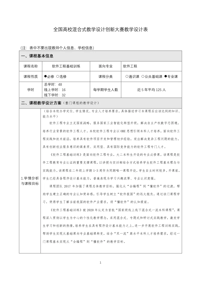 全国高校混合式教学设计创新大赛特等奖案例——《软件工程基础训练》