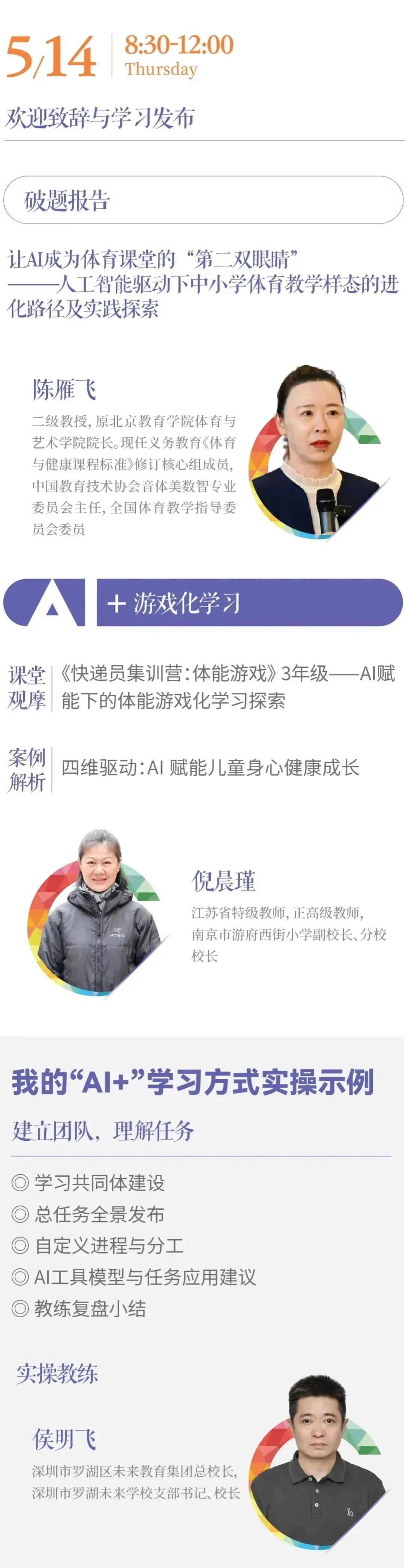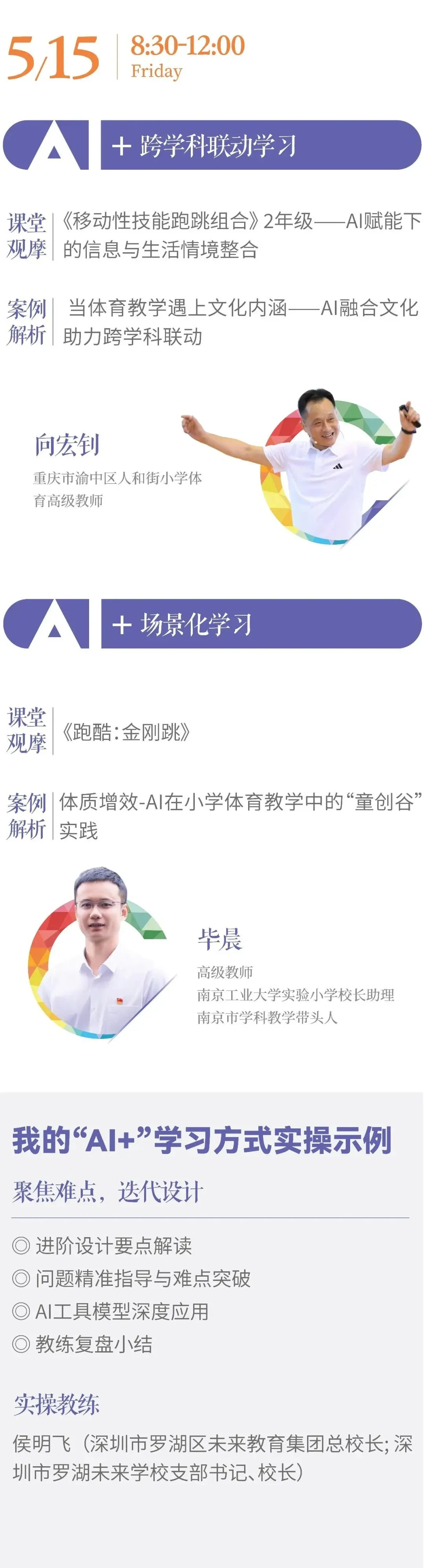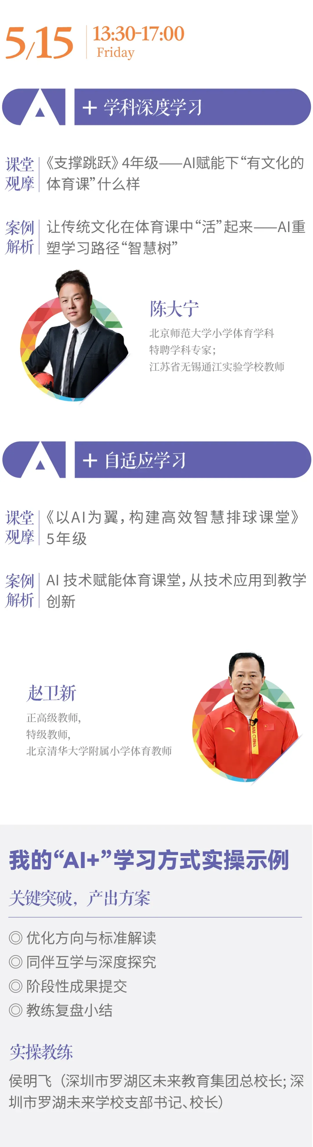 两大学科沉浸式观摩课例:5月14-16日(体育)、5月17-19日(英语),邀请全国名师及具有前沿实践的学校团队,立体呈现技术如何“穿透”学科。