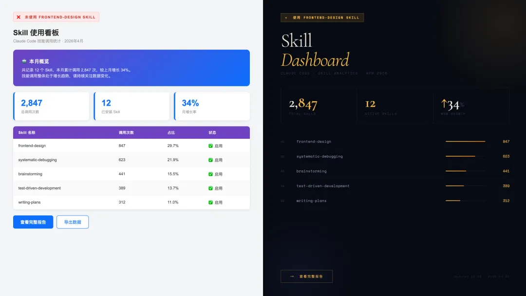 这是 CC 官方内置的一个 skill,可以产出一个更好的前端设计。比如说同一个提示词,上图是使不使用这个 skill 的前后对比。相当于它内置了一些设计规范,让 AI 输出的效果更好。