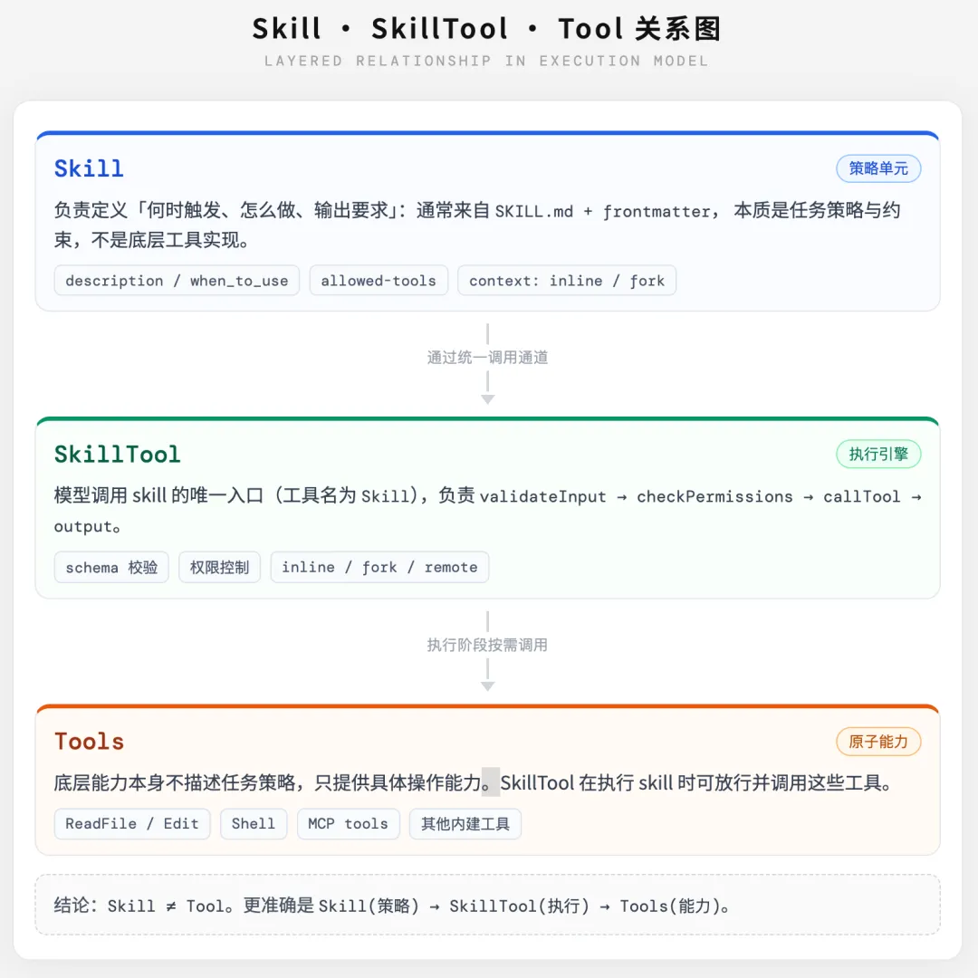 Tool 属于能力层,定义了各种模型的原子化能力,但并不会深入到业务和策略层面。而 Skill 是一种基于 Tool 的策略层。把各种能力组合成为具体的解决方案。