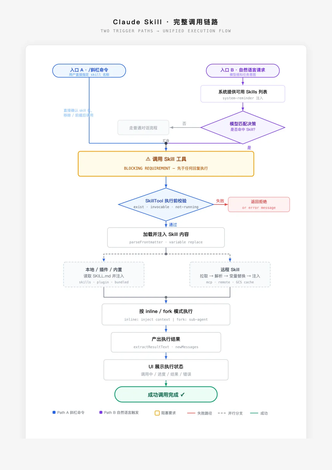 之前的文章(Claude Code 源码精读 | 03 Tool工具如何让模型长出双手?)我们讲过,Skill 在设计上是一种Tool工具。所有 skill 都通过 SkillTool 被调用。