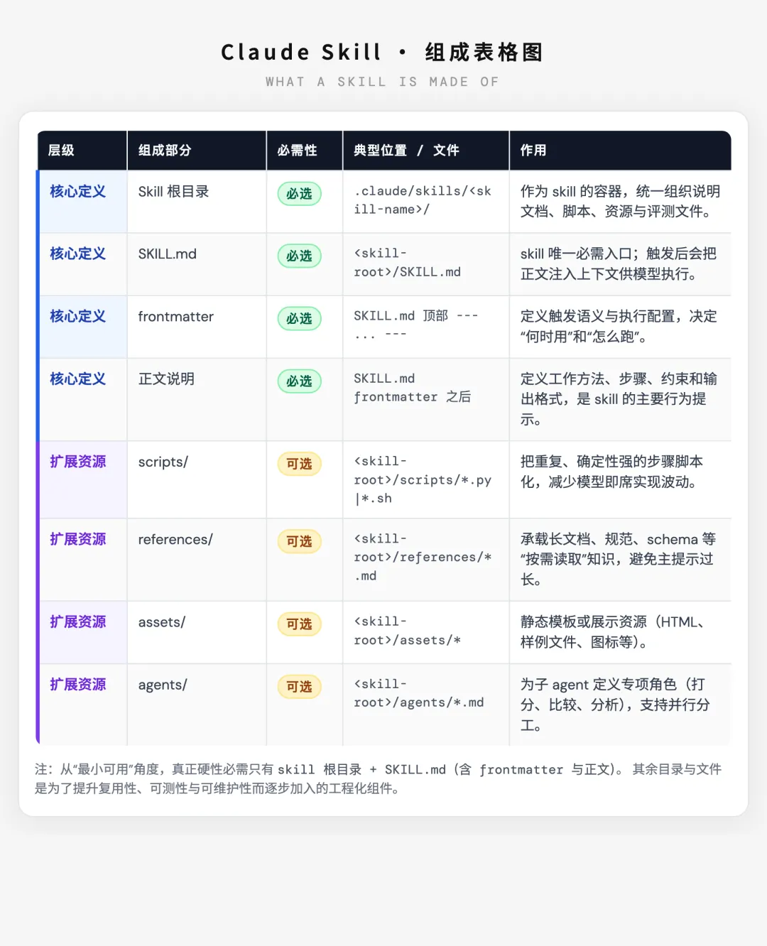 附属资源不是必须的,最核心的模块就只有 Skill.md,很多简单的 Skill,其实就是一个封装好的大型提示词文件,定义好了什么时候用,怎么用的执行步骤规范。