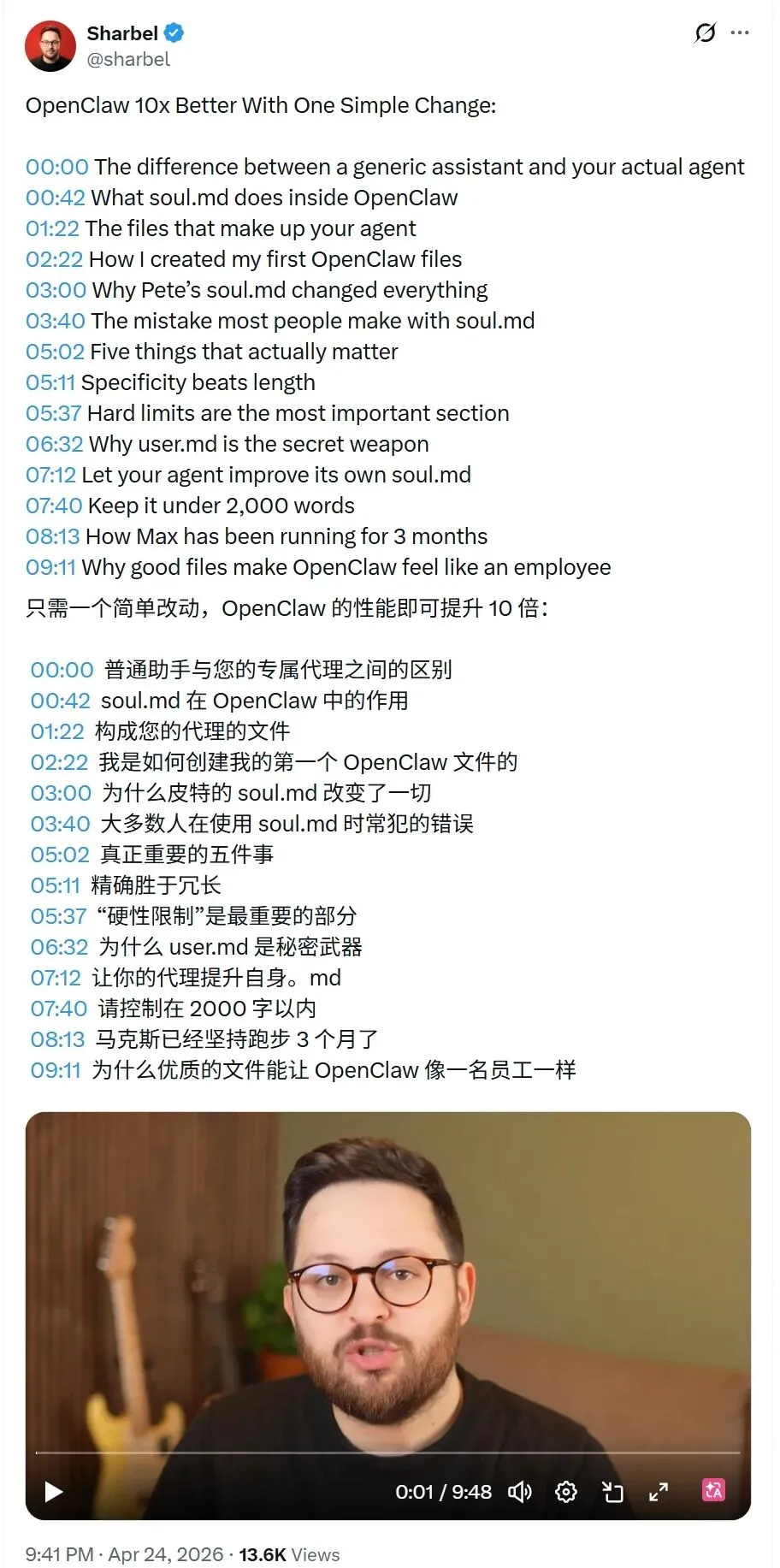 Sharbel 这条视频里,把 soul.md、user.md、hard limits 这些文件的重要性讲得很透。