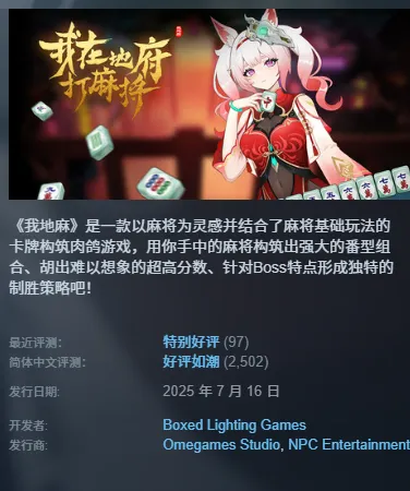 这款游戏就是——《我在地府打麻将》(后面简称《我地麻》),一款国产高分高口碑的独立游戏,目前玩家可以在Steam上和安卓手机端体验。