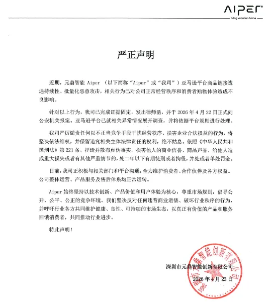 4 月 23 日,全球无线泳池机器人头部品牌Aiper(母公司:深圳市元鼎智能创新有限公司) 发布声明,称其在亚马逊平台的商品链接遭遇大量持续性、批量化恶意攻击,相关行为已经对企业正常经营秩序与消费者购物体验造成不良影响。