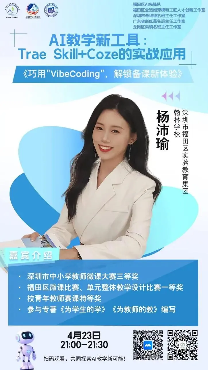 在福田区 AI 先锋队的指导和广东省赵红燕名班主任工作室的支持下,深圳市朱维维名班主任工作室联合福田区全远姬劳模和工匠创新人才工作室以及龙岗区梁徜名班主任工作室,于 4 月 23 日晚 21:00-21:30,线上举办了 AI 赋能教学分享沙龙活动。福田区教师发展中心郭恒武老师、深圳市福田区实验教育集团翰林学校杨沛瑜等老师齐聚云端,共同探索 Trae Skill+Coze 在教育教学场景中的实战应用,围绕《巧用 “VibeCoding”,解锁备课新体验》主题展开深度分享,为一线教学减负增效。
