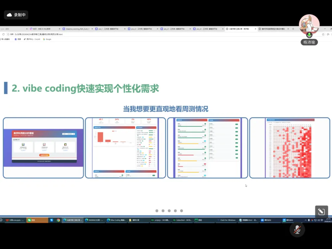 除此之外,她还分享了 Vibe Coding 在个性化教学中的多元落地场景:上传成绩单与考试细目表,AI 即可自动生成周测数据看板,输出知识点得分率热力图与学生个体学情分析,助力教师实现精准讲评;通过拖拽组件模拟停车场车位排布、调节参数还原潮汐车道车流变化,将抽象的数学问题具象化,破解了项目式学习中复杂情境难以实地验证的难题。